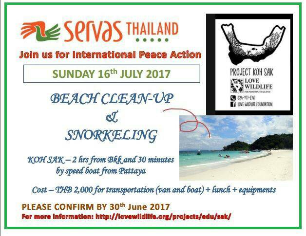 This is part of the (early) celebrations of the International Day of Peace (Sept.21st). We are going to do beach clean-up and snorkeling at Koh Sak (near Pattaya) together with a NGO called Love WildLife. Contact @email for more information and how to join. ( http://lovewildlife.org/projects/edu/sak/)